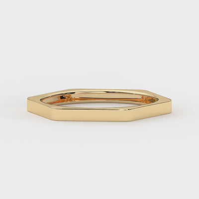 The 14K gold hexagon ring is a solid gold geometric band designed to offer both style and durability, delivering a comfortable fit with its smooth interior and bold hexagonal ring design. This minimalist gold ring serves as a unique wedding band or stackable gold ring that enhances any women's gold jewelry collection with everyday elegance. Crafted from durable solid gold, this bolt shape ring measures approximately 1.82 mm in width, with corner points extending to 5.51 mm and a thickness of about 1.04 mm, balancing subtlety with statement presence. The polished finish ensures comfort throughout the day, while each handcrafted gold ring is made to order for lasting quality and style.