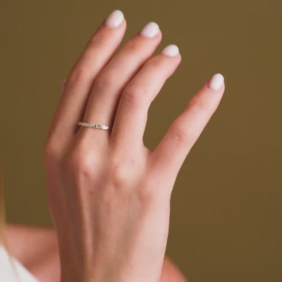 The baguette wedding band solid gold diamond ring offers timeless elegance and subtle sophistication for brides seeking a minimalist bridal band. This dainty gold stacking ring features seven baguette-cut diamonds set in a sleek bar setting, delivering lasting brilliance with a slim profile measuring approximately 1.37 mm in width and 1.21 mm in thickness for comfortable daily wear and easy stacking alongside other rings.