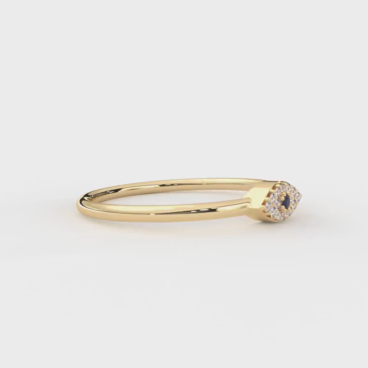 The blue sapphire evil eye ring is a stunning solid gold ring designed to protect and elevate your style with its unique diamond evil eye ring motif. This dainty gold band features a round cut sapphire center stone surrounded by sparkling diamonds, creating a minimalist gold ring that serves as both protective eye jewelry and a good luck charm ring. Crafted as a handmade gold ring, this stackable gold ring blends fine jewelry gift appeal with everyday wearability. Made from premium solid gold, this custom gemstone ring offers lasting durability and a smooth, polished finish for comfortable daily wear. The center round cut sapphire measures approximately 1.22 x 1.22 mm, while the 14 side stones are each 0.9 x 0.9 mm in size, all set in an elegant pave setting to maximize sparkle and protection symbolism.