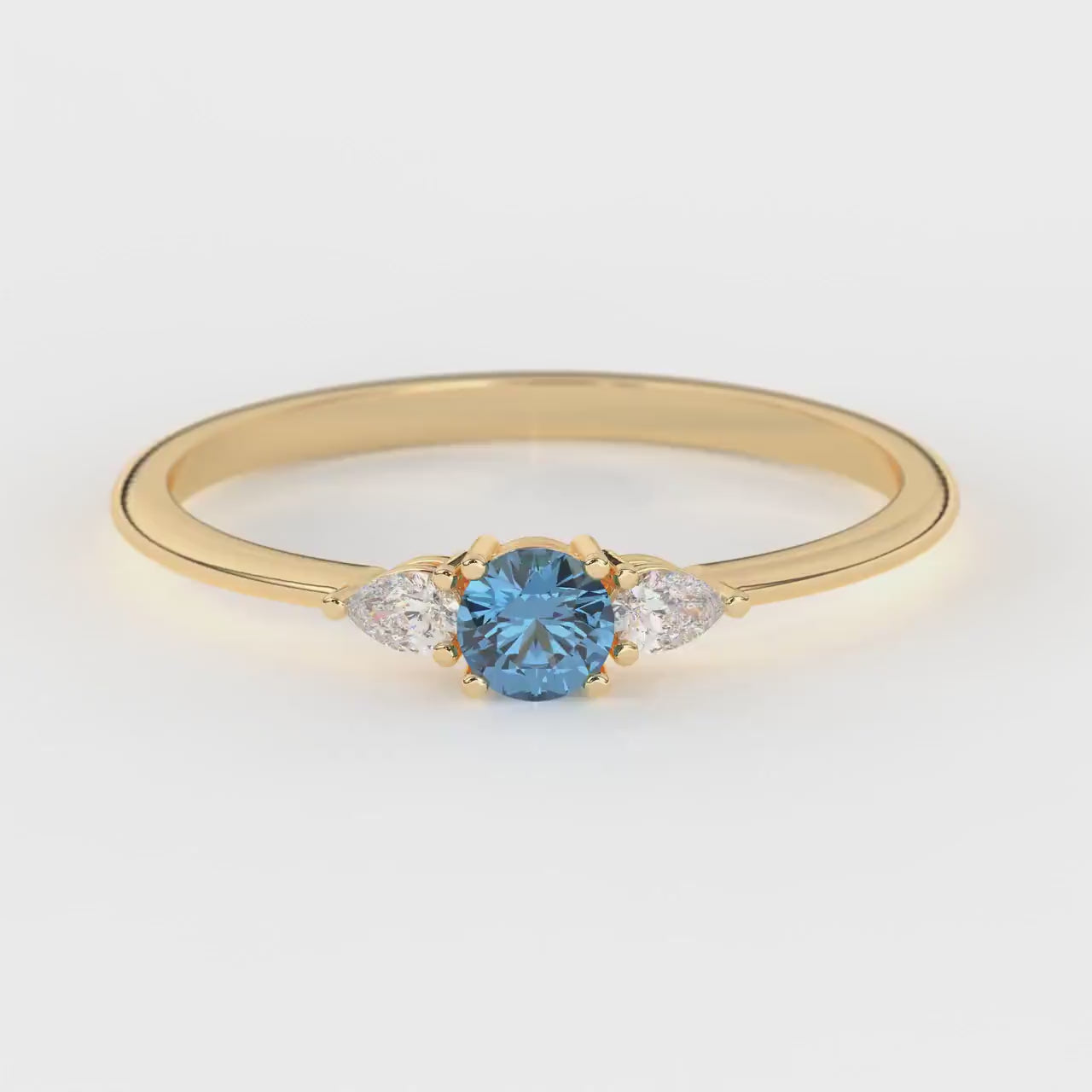 This blue topaz ring is a handcrafted 14k solid gold ring designed to deliver a dainty gold ring style that blends minimalist gemstone ring elegance with everyday wearability. Featuring a round blue topaz center stone measuring 3.75 x 3.75 mm, this personalized gold ring offers the December birthstone's vibrant hue set securely in a thin gold band approximately 1.18 mm wide and 1.26 mm thick. The delicate stackable ring includes two pear shaped diamonds, each sized at 3 x 2 mm, adding subtle sparkle and making it an ideal valentines day gift that combines beauty with meaningful symbolism.