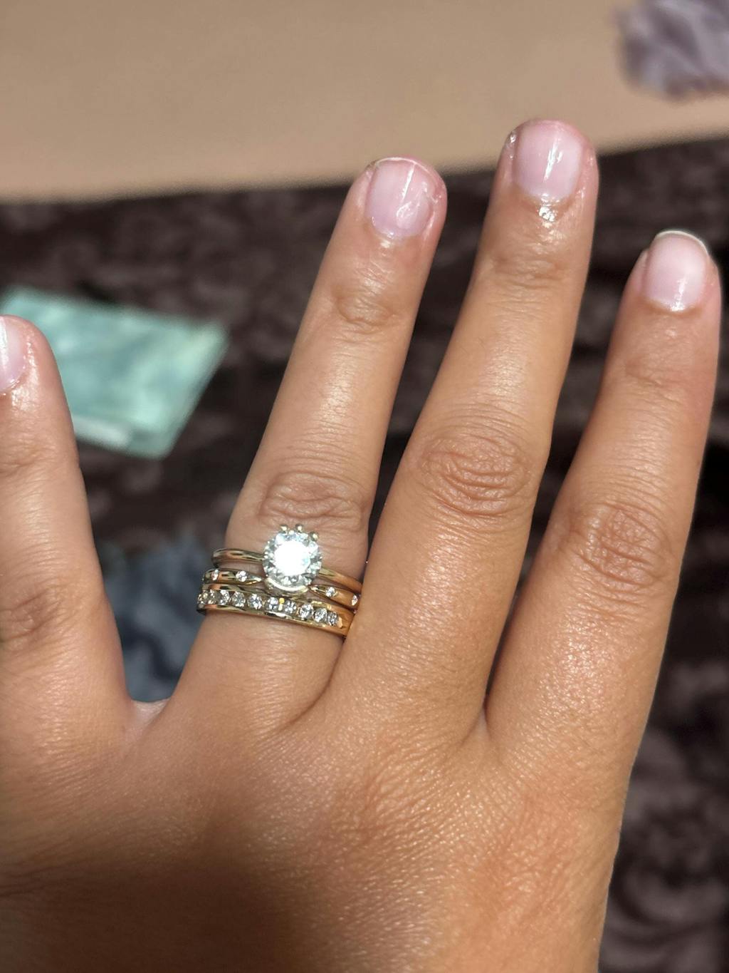 - Stones: Ten round cut diamonds measuring 1.1 x 1.1 mm each set in a flush set ring style