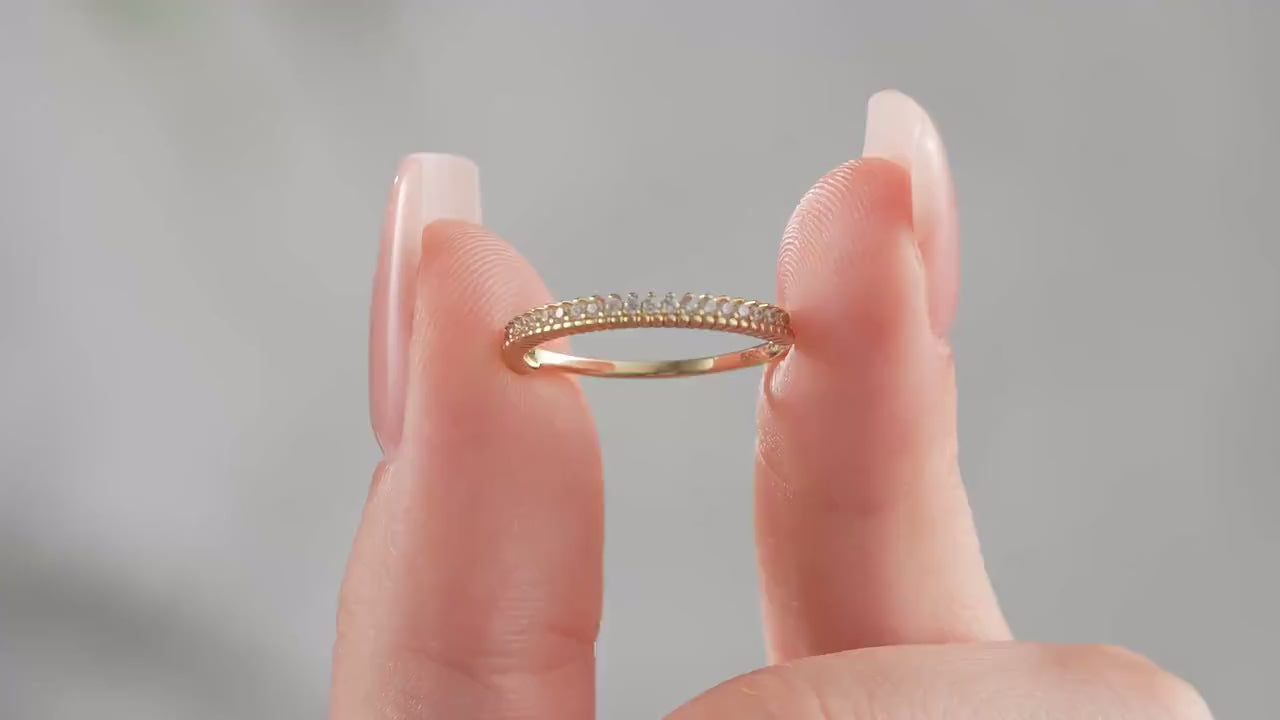 This half eternity gold ring offers a delicate yet durable design that enhances everyday elegance. Crafted in your choice of 14K or 18K solid gold, this thin gold ring features a scalloped pave ring style with 25 round cubic zirconia stones set in a shared prong ring construction along the upper half of the band. The ribbed edge ring profile beneath the stones adds texture and depth, creating a modern pave ring effect that maximizes sparkle and light reflection. Measuring approximately 2.25 mm wide at the top and narrowing to 1.15 mm at the bottom, this minimalist gold band balances comfort with refined style, making it an ideal stacking ring gold option for layering with your favorite pieces.