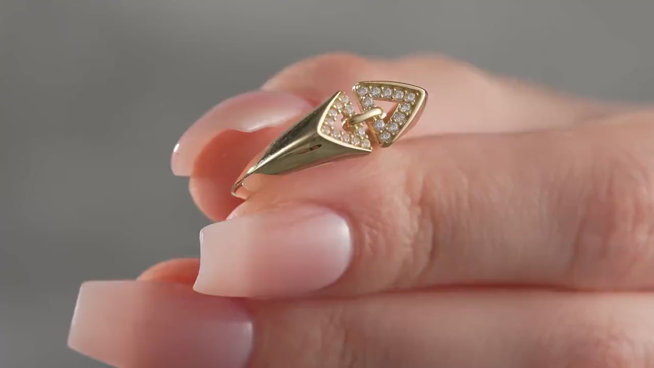The linked triangle pavé ring is a solid gold ring designed to deliver a modern architectural ring design that blends elegance with bold geometry. This geometric gold ring features a double triangle ring motif connected by a delicate center link, creating a dainty statement jewelry piece that complements any style. Featuring pavé-set cubic zirconia stones, the linked triangle pavé ring provides sparkle and sophistication while remaining lightweight and comfortable for everyday wear.