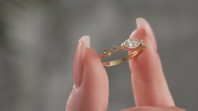 The marquise bezel ring is a solid gold ring designed to showcase a customizable center stone, offering a vintage style jewelry piece that combines elegance with personal meaning. This marquise cut ring features a protective bezel setting design that secures the centerpiece while highlighting its unique shape. The center stone measures 7.0 x 5.0 mm and can be personalized with your choice of birthstones including sapphire blue, ruby red, emerald green, aquamarine, pink, yellow, or the default white AAA cubic zirconia for brilliant sparkle. Four round accent stones, each 2.2 x 2.2 mm with milgrain detailing, add texture and timeless charm to this gold bezel ring.