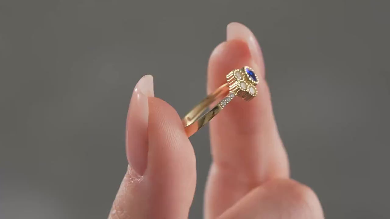 The marquise sapphire ring is a stunning piece of blue sapphire jewelry designed to deliver elegance and timeless style. Featuring a marquise cut sapphire-colored cubic zirconia set in a solid gold bezel setting ring with a delicate milgrain edge ring design, this handcrafted gold ring offers a dainty cluster ring effect with a cluster accent ring of three round cut stones above the center gem and a pavé stone band that runs along the slender band. This statement sapphire ring combines durability and refined beauty, making it perfect for engagements, special gifts, or everyday wear.