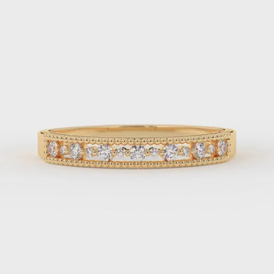 The milgrain diamond band is a vintage gold ring designed to enhance bridal and anniversary moments with lasting beauty. This delicate bridal jewelry piece features a dainty gold band crafted from solid gold, showcasing a row of sparkling cubic zirconia stones set securely in a prong setting ring style. Measuring approximately 2.04 mm wide and 0.94 mm thick, this stackable wedding band delivers refined texture and exceptional sparkle for everyday elegance. Each cubic zirconia ring contains thirteen high-grade AAA stones in two sizes—seven stones at 1.7 x 1.7 mm and six stones at 1.0 x 1.0 mm—ensuring consistent brilliance and clarity for a radiant look. Our craftsmanship is backed by a satisfaction guarantee; every piece is carefully handmade and inspected to meet rigorous quality standards.