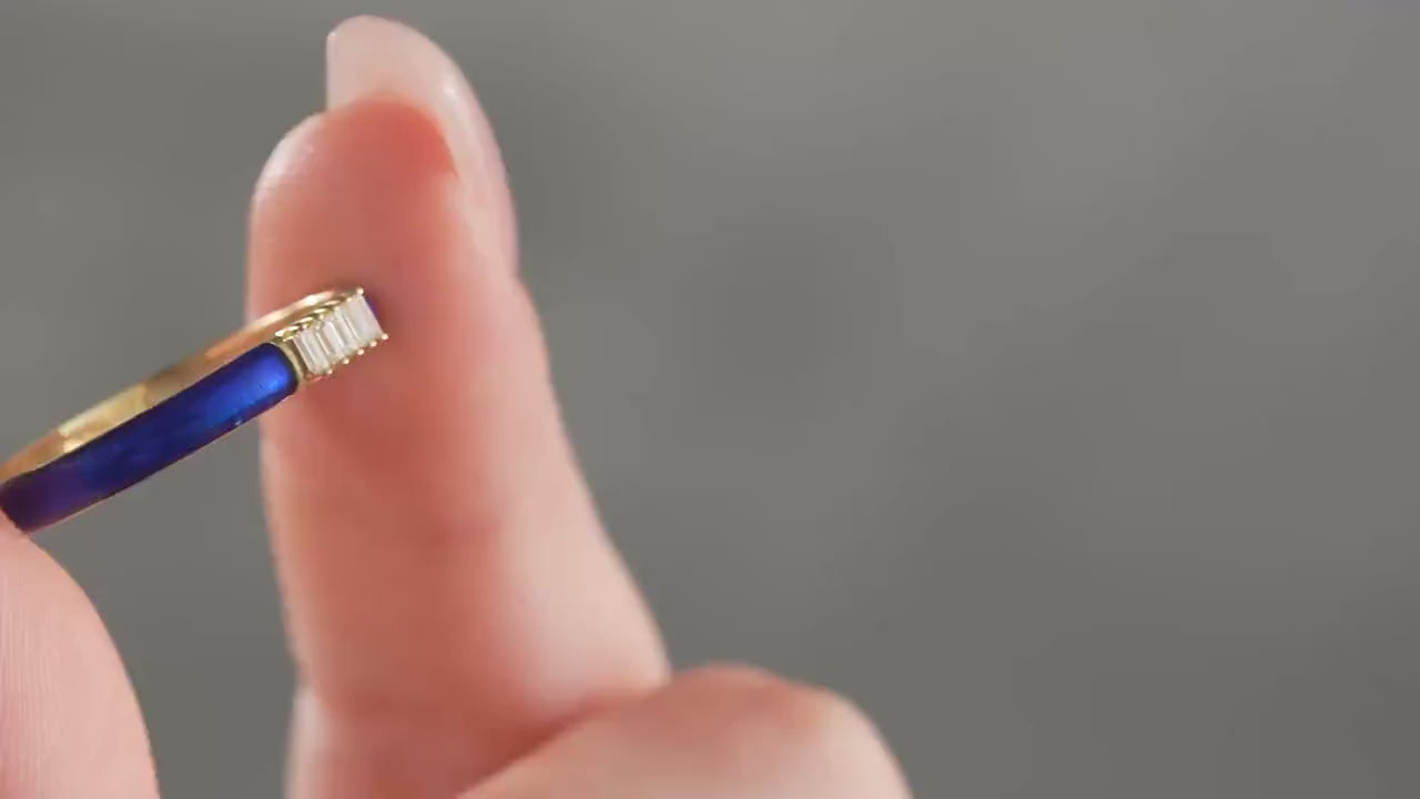 Navy Blue Enamel Ring Solid Gold Band Five Baguette Diamonds