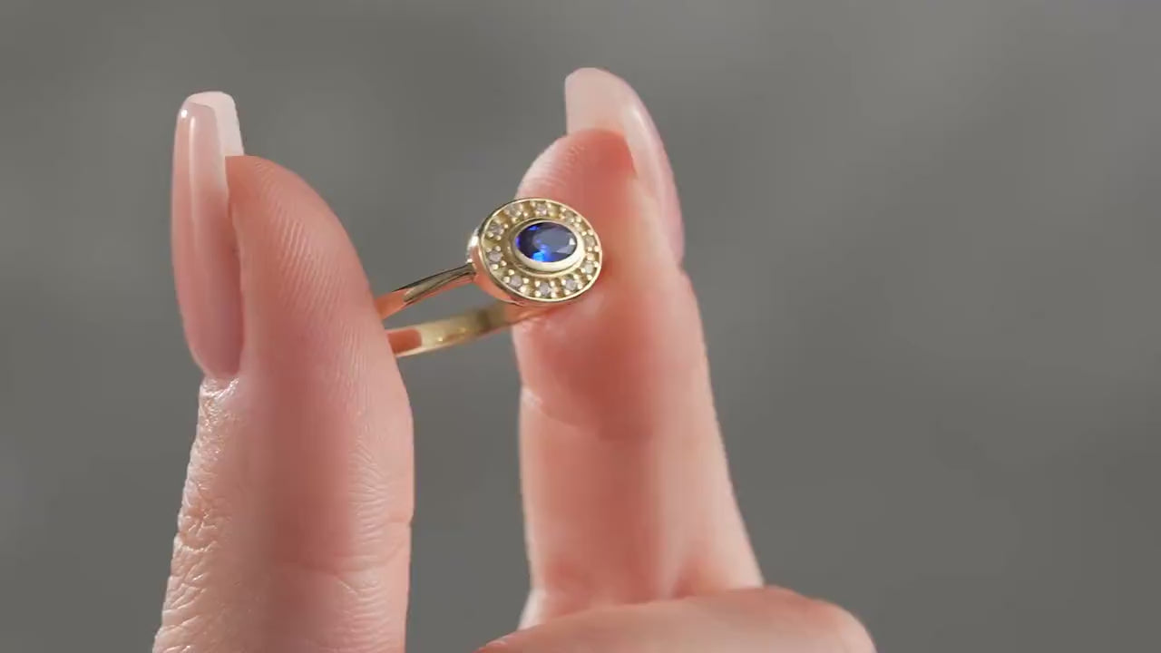 This oval bezel halo ring features a stunning 5 x 3 mm oval sapphire gemstone set securely in a solid gold bezel frame, creating a timeless statement birthstone ring that combines elegance with durability. The micro pave halo design surrounds the center stone with ten round AAA-grade cubic zirconia stones, enhancing its brilliance and sparkle. Crafted with a classic polished band measuring approximately 8.20 mm at the top and tapering to 2.15 mm at the bottom, this customizable gold ring offers comfortable wear and lasting style. Available in rose gold, yellow gold oval band, and white gold options, this handcrafted gold jewelry piece is made to order and backed by a quality guarantee.