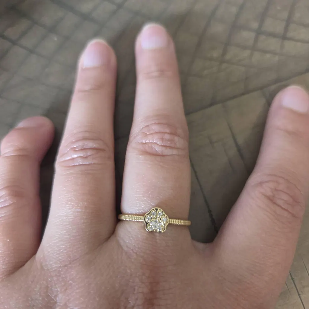 The paw diamond ring is a beautifully crafted solid gold CZ stone pet paw ring designed for animal lovers who want to celebrate their furry friends with style and elegance. This 14k gold paw ring offers a minimalist dog paw ring design that delivers both charm and durability, making it the perfect accessory for everyday wear or special occasions. Featuring the highest grade AAA cubic zirconia stones set in a secure prong setting, this paw diamond ring shines brilliantly while maintaining a delicate and dainty look.