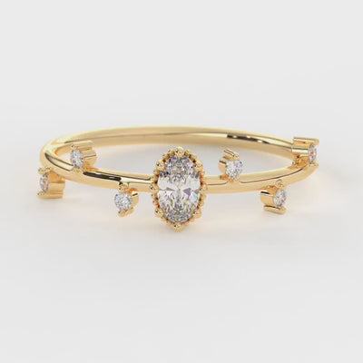 This diamond wedding band is a dainty cluster diamond ring crafted from 18K solid gold, designed to be the perfect gold bridal ring that offers elegance and timeless beauty. Featuring a delicate promise ring style, it showcases an oval cut diamond centerpiece surrounded by six smaller round diamonds in a minimalist gold band setting. This handcrafted gold ring measures approximately 1.16 mm in width and 1.09 mm in thickness, making it a thin diamond band ideal for brides who prefer subtle yet stunning gold wedding jewelry. The ring’s cluster design creates a sparkling focal point that symbolizes unity and everlasting love, making it an exceptional bridal jewelry gift or engagement gift ring.