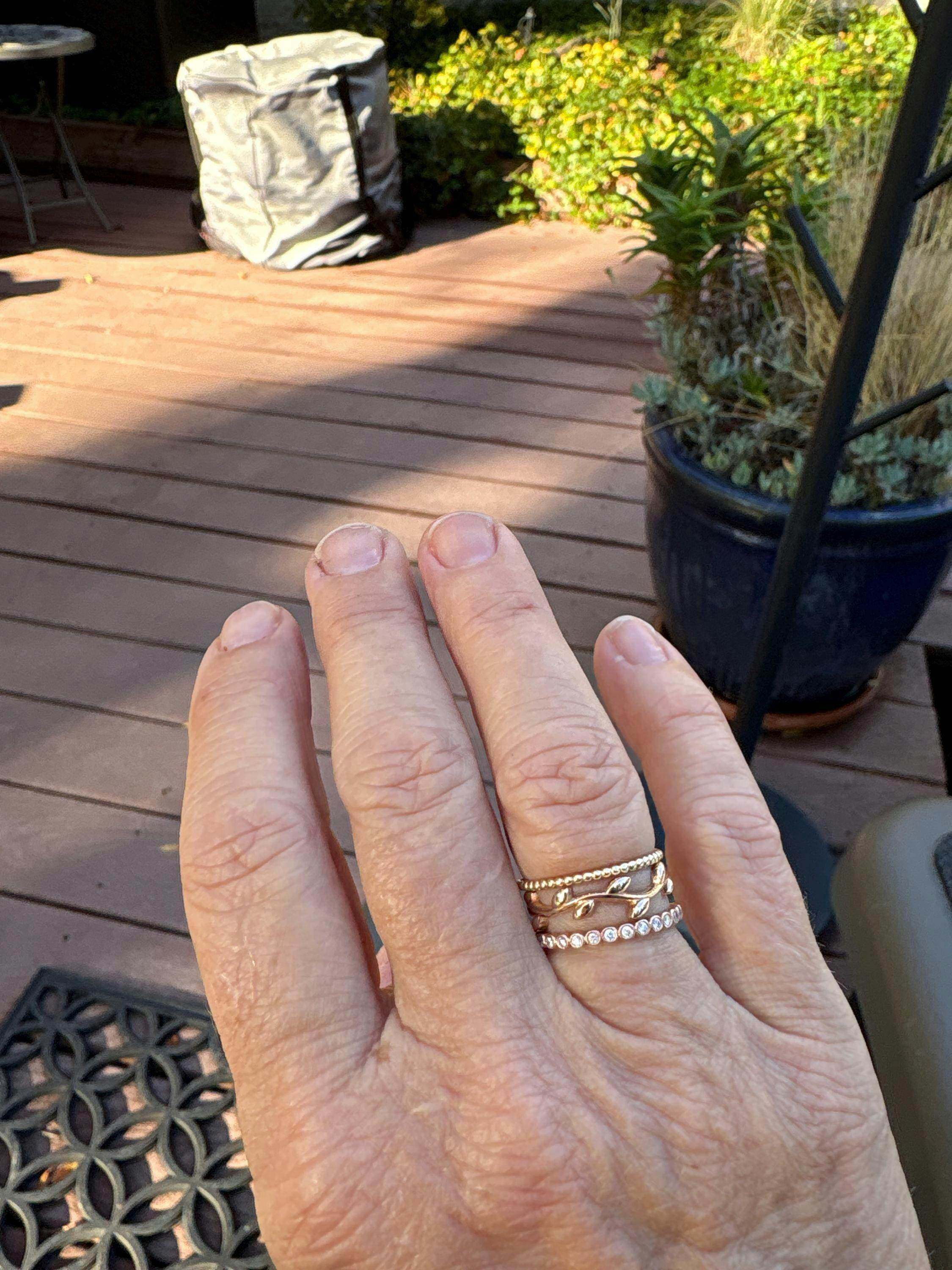 Our solid gold leaf ring blends minimalist design with nature's elegance, creating a stunning accessory that symbolizes peace and harmony. This 14 karat gold leaf ring offers a delicate floral touch while delivering lasting quality and style for everyday wear or special occasions. Crafted from premium solid gold, it ensures durability and a polished finish for comfortable wear. The ring measures approximately 1.05 mm in width and 1.13 mm in thickness, making it a perfect dainty floral ring or gold stacking ring to complement any collection.