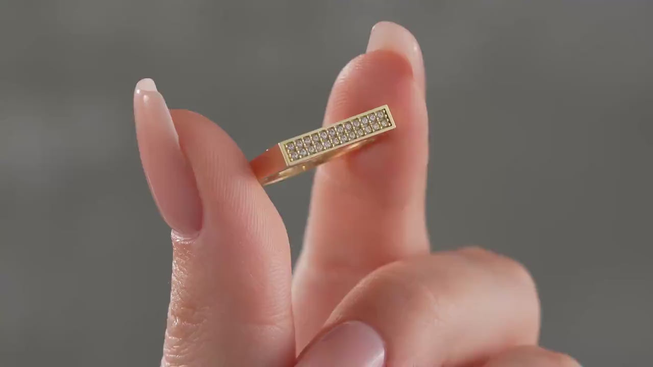 This solid gold pave ring is a stunning rectangular bar ring designed to elevate your style with its modern geometric bar ring silhouette. The 14k gold pave ring features a rectangular bar top fully paved with sparkling CZ diamonds, delivering minimalist statement ring elegance that suits both stacking and solo wear. Crafted for everyday luxury, this pave setting ring combines sleek design with the brilliance of AAA cubic zirconia stones, offering the look of a gold diamond ring without compromising value.