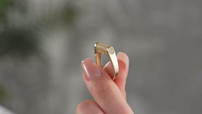 This solid gold pave ring offers a bold barrel shape design with a thick gold band, delivering a striking look for modern gold jewelry lovers seeking a luxury gold ring that combines elegance and durability. Crafted from solid gold, this handcrafted gold ring features 67 round cut diamonds set in a precise micro pave setting, ensuring continuous brilliance and a sparkling CZ ring effect from every angle. The barrel shape ring measures approximately 4.30 mm at the top and tapers to 3.00 mm at the bottom, providing both comfort and standout style. Tested for quality and backed by our satisfaction guarantee, this gold statement ring is perfect for anyone wanting a bold fashion ring with lasting shine.