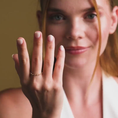 This petite diamond ring is a delicate 14K solid gold ring designed to enhance your style with elegance and subtlety. Perfect as a stacking engagement ring or a dainty wedding band, this thin gold band features seven round cubic zirconia stones set in a secure prong setting, each measuring approximately 1.75 x 1.75 mm. Crafted to deliver minimalist charm, this diamond stackable ring offers a refined look that complements any outfit or occasion while providing lasting shine and durability.