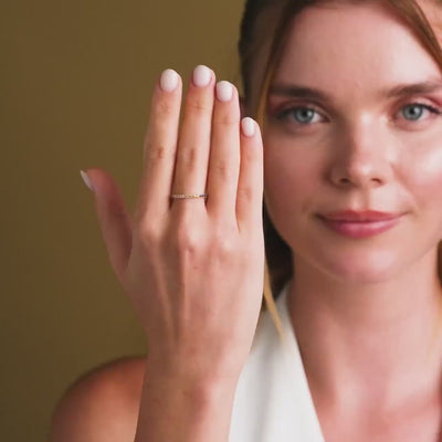 This 14k gold rainbow ring is a dainty gold band designed to celebrate life's colorful moments with vibrant birthstone jewelry. Crafted from solid 14k yellow gold, this slim gold band features pave set gemstones that form a seamless rainbow eternity band, perfect as a colorful stacking ring or an anniversary gift ring. The multicolor gold ring showcases 19 round, AAA-grade cubic zirconia stones, each measuring 1.4 x 1.4 mm, set in a delicate 1.55 mm wide top band that tapers slightly to 1.49 mm at the bottom with a thickness of approximately 1.32 mm.
