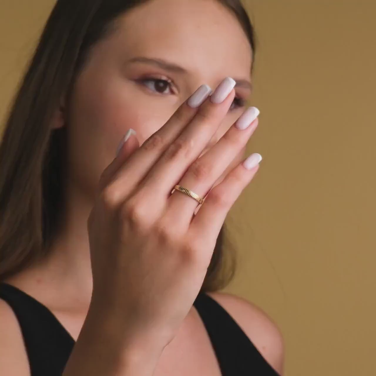 This solid gold wedding band is a beautifully crafted 14k gold ring designed to celebrate love with timeless elegance. The solid gold wedding band features a fluted wedding band texture that adds depth and character, making it a perfect unisex wedding ring for both men and women. Crafted to deliver lasting shine and strength, this textured gold band ensures your special moment is marked by a stunning accessory that lasts a lifetime.