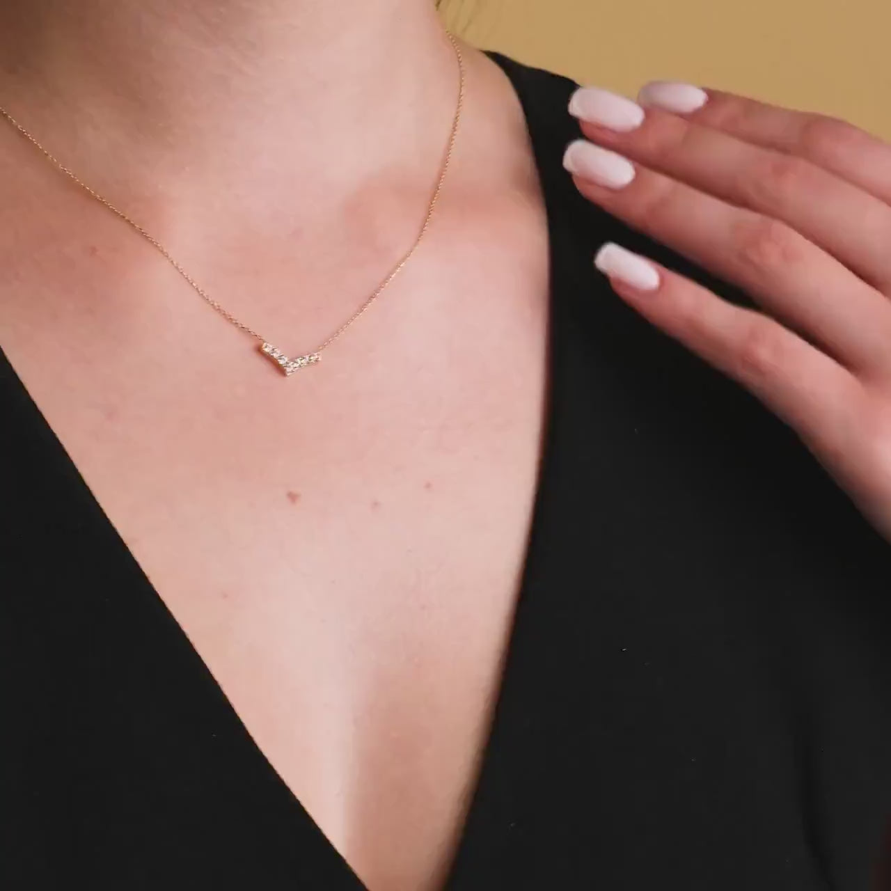 The V-Shaped Chevron Necklace is a dainty gold necklace designed to enhance your everyday style with a minimalist layering necklace appeal. This v-shaped chevron necklace features a solid gold pendant crafted from premium 14k gold jewelry, creating a delicate yet eye-catching accessory. Measuring approximately 0.56 inches wide and 0.28 inches high, it offers subtle elegance for any occasion. The cz diamond pendant includes seven round AAA grade cubic zirconia stones, each 2 x 2 mm, set securely in prongs to maximize sparkle and durability. Handcrafted with care, this yellow gold necklace is also available in rose gold layering and white gold options to suit your personal style or gift preferences.